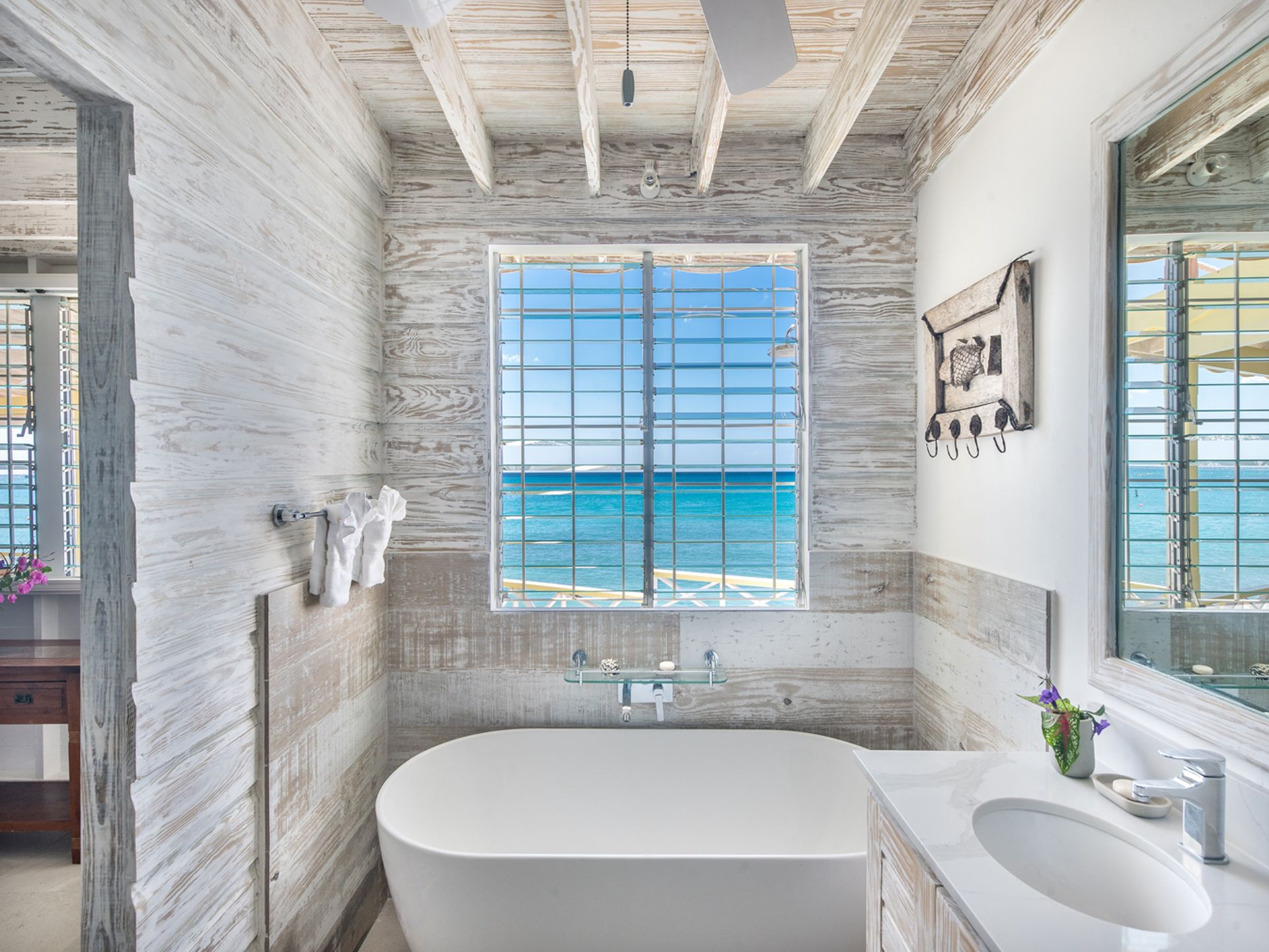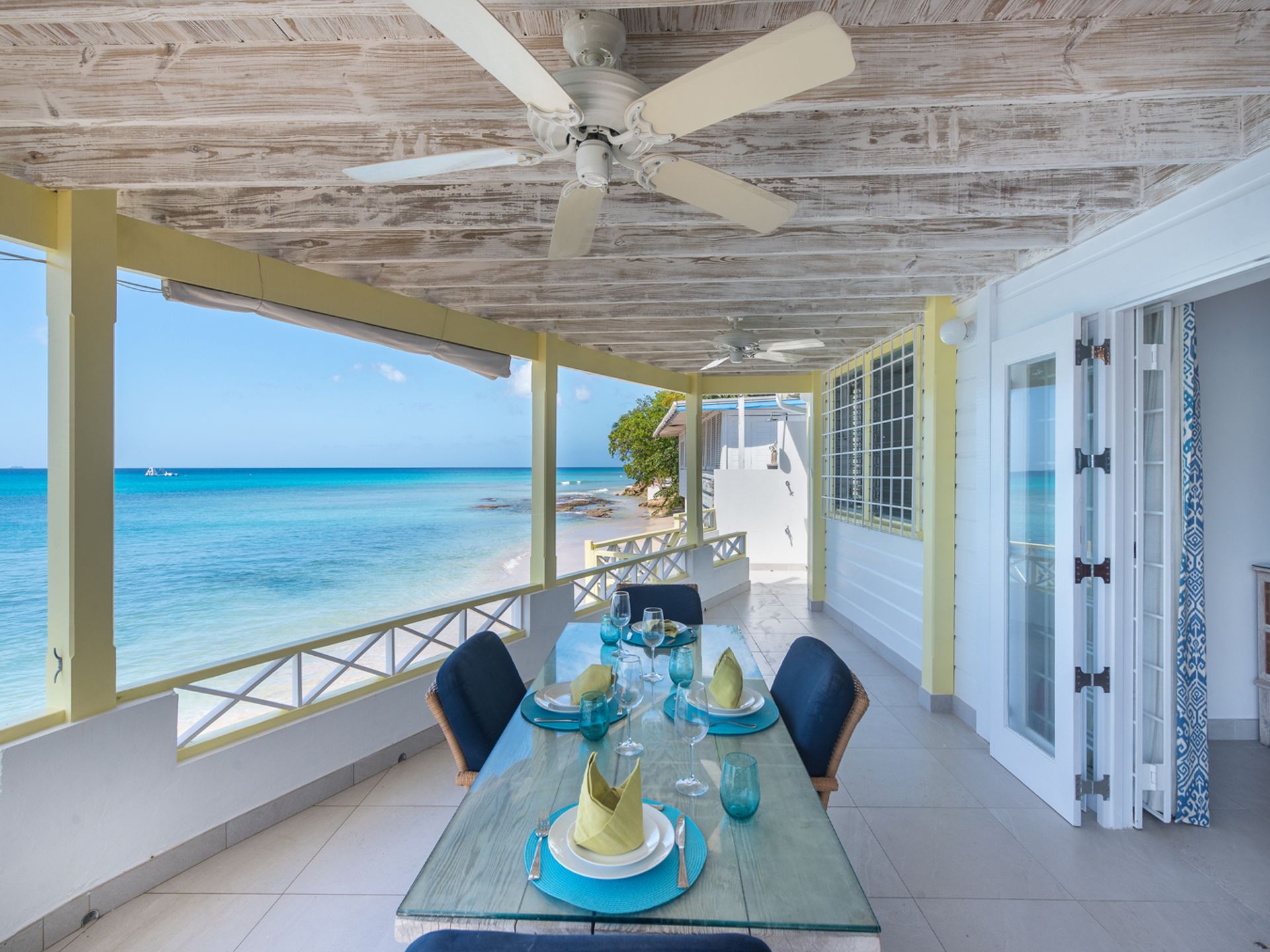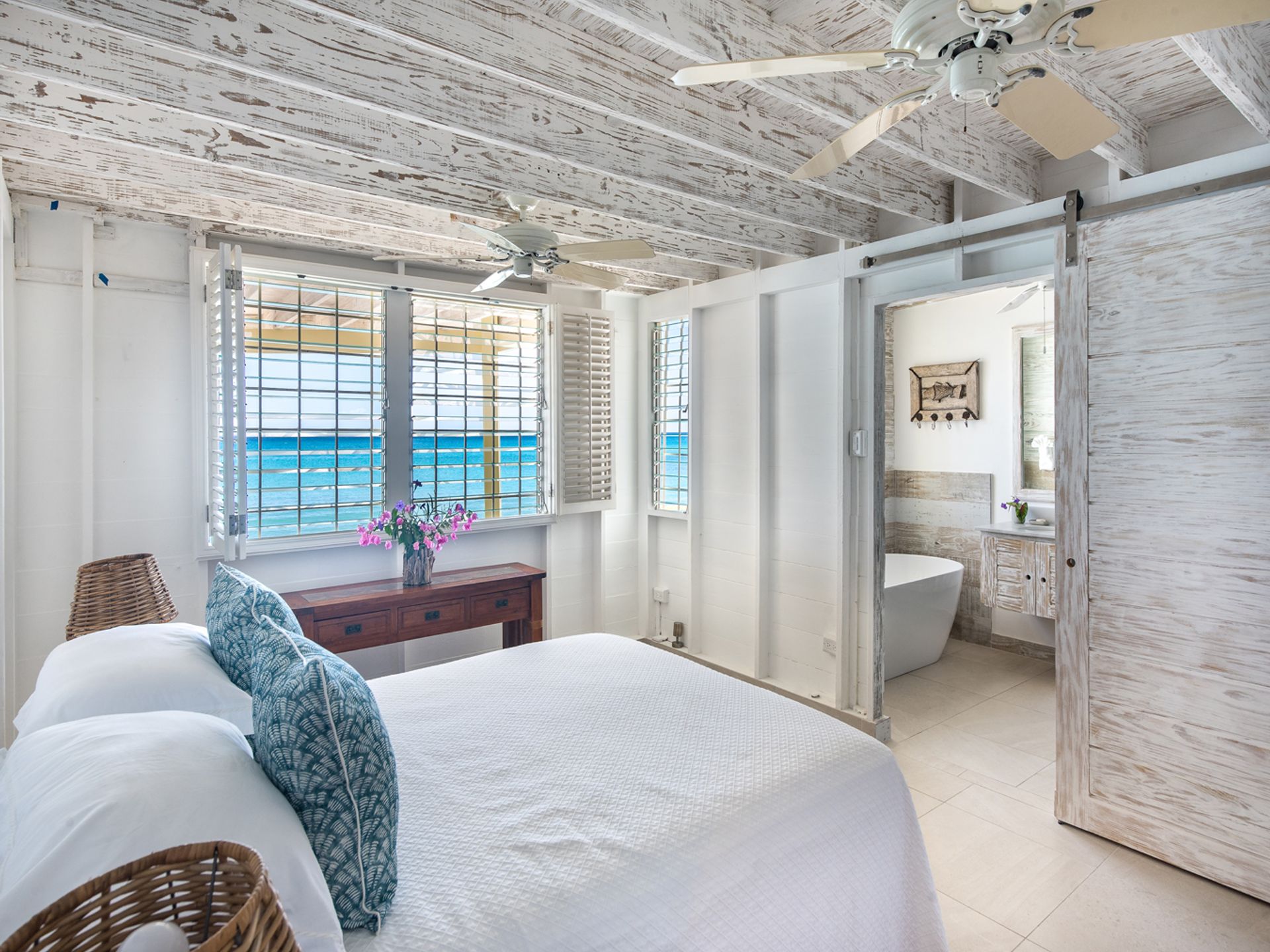 A beautiful 3 bedroom oceanfront cottage located just north of Mullins Beach in St Peter. Sunset Reach was renovated in 2022 when the third bedroom was added. There are wonderful sea views, stairs lead to a sandy cove on the north side of building and Mullins Beach is just a few steps away to the south. There are two bedroom suites on the ground floor, one with a sea view, a well-equipped kitchen, laundry room and a living room that opens to a covered seaside dining terrace and uncovered deck with stunning sea views. The main bedroom suite upstairs has a pickled pine dormer ceiling, a private balcony and great views of the sea and Mullins Bay.