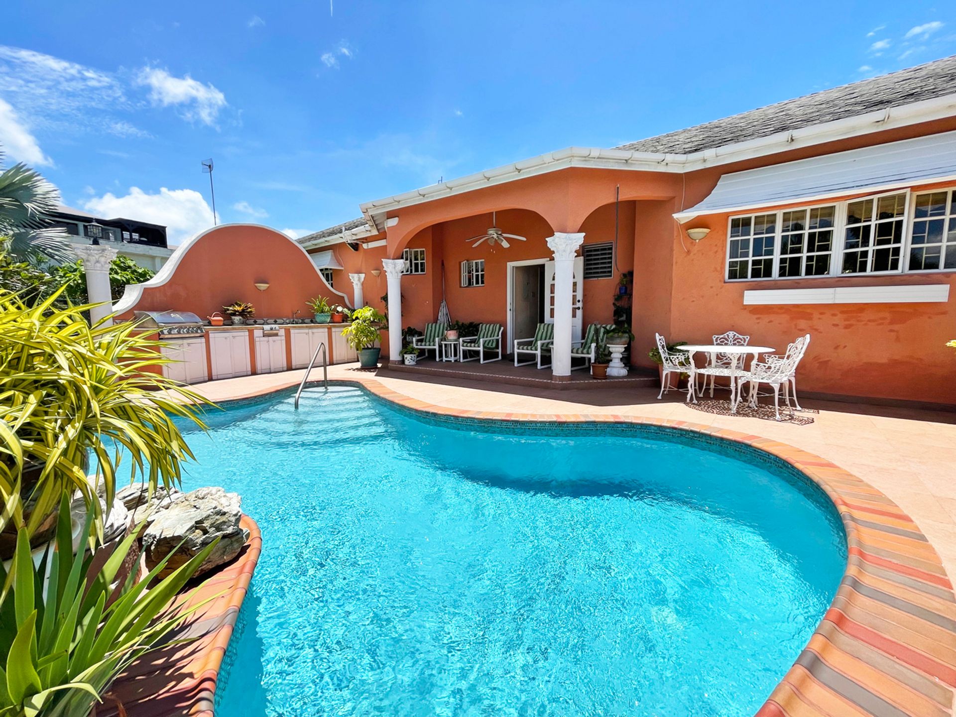 This immaculate home is located at Carlton View, St James. Consisting of a 2 bedroom main house plus office, 2 1/2 bathrooms; a two bedroom, one bathroom cottage and a fully equipped one bedroom apartment, so up to 5 bedrooms in all, in three separate residences. The cottage and main house have separate verandas and entrances and a very large double garage with automatic doors connect the cottage and main house. The main house has a custom kitchen and the cottage has a full size kitchen and both have separate laundry rooms. the apartment entrance is from the back garden. An inviting swimming pool with terrace and Bar B Q area can be accessed from the main house or the garden. The entire property is fenced. Casa de Flores is a beautiful multiple-family home within a desirable St James neighbourhood close to the beaches and amenities of the west coast.