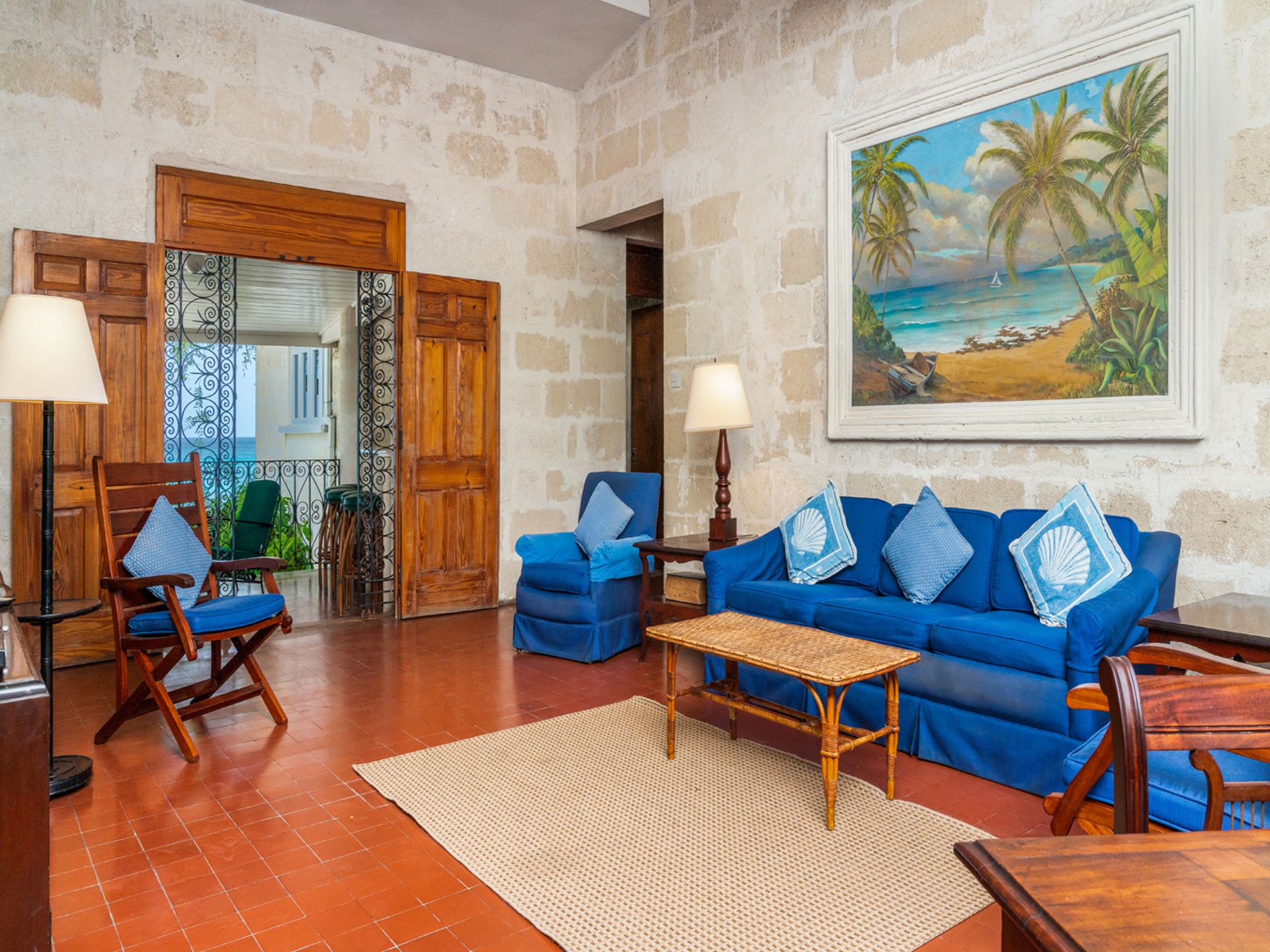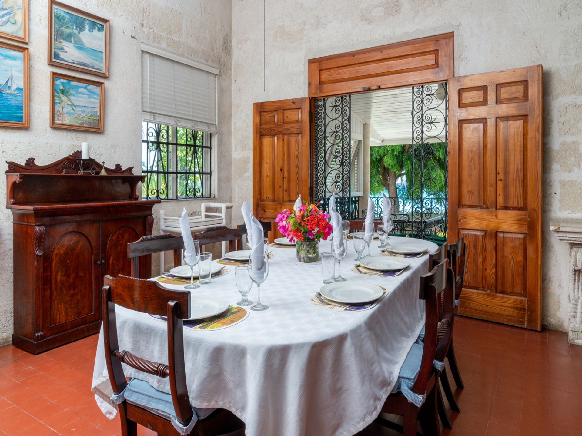 The delightful coral stone villa has an extensive open-plan dining and living area, designed to capture tropical breezes and provide views of the sea. This room opens on to a large, covered veranda with a bar. The perfect spot to dine or relax, overlooking the sparkling Caribbean Sea.